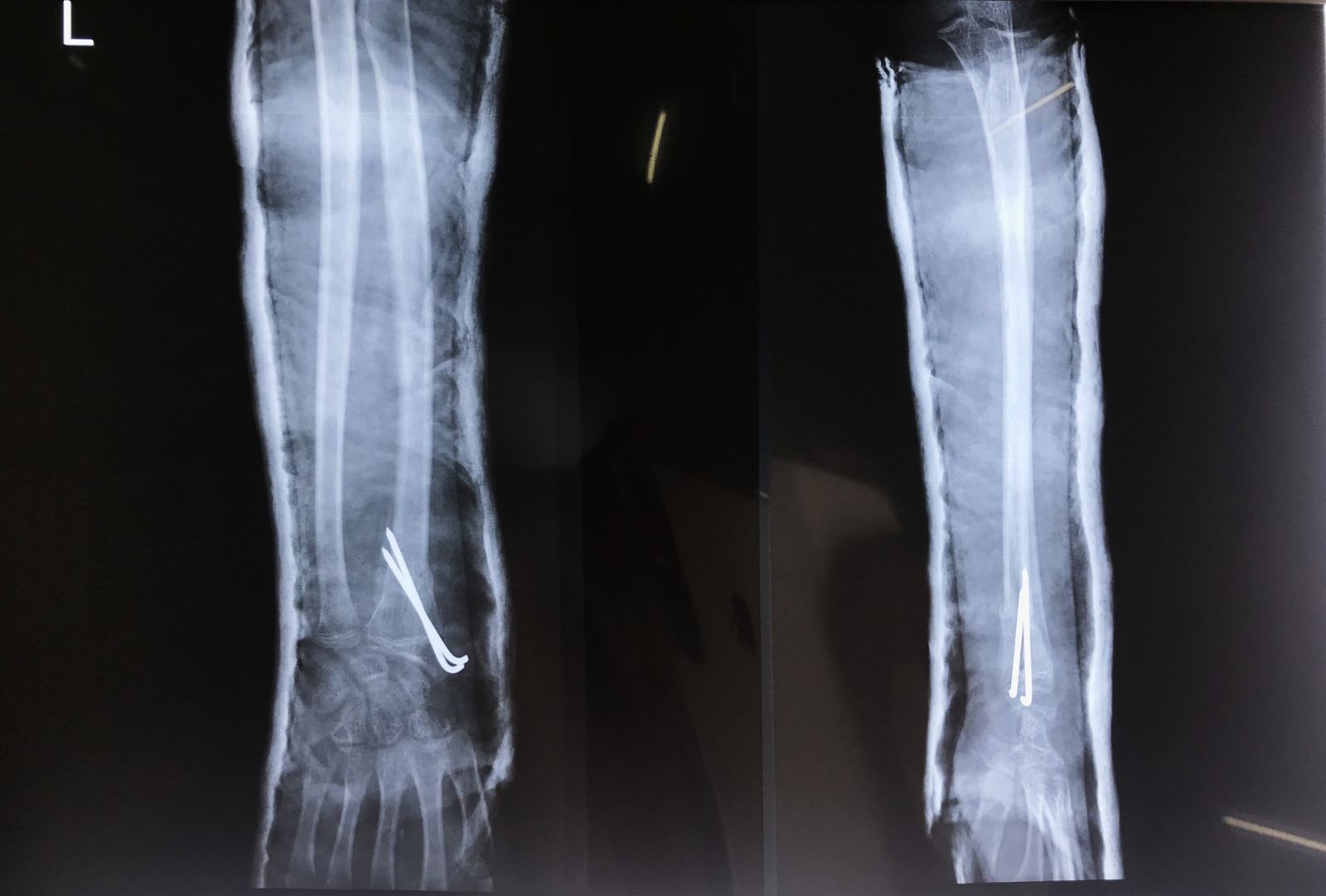 + Gãy xương quay 2 tầng, 1 ổ gãy ở hành xương, 1 ổ gãy bong sụn tiếp hợp, có nguy cơ hàn sụn tăng trưởng