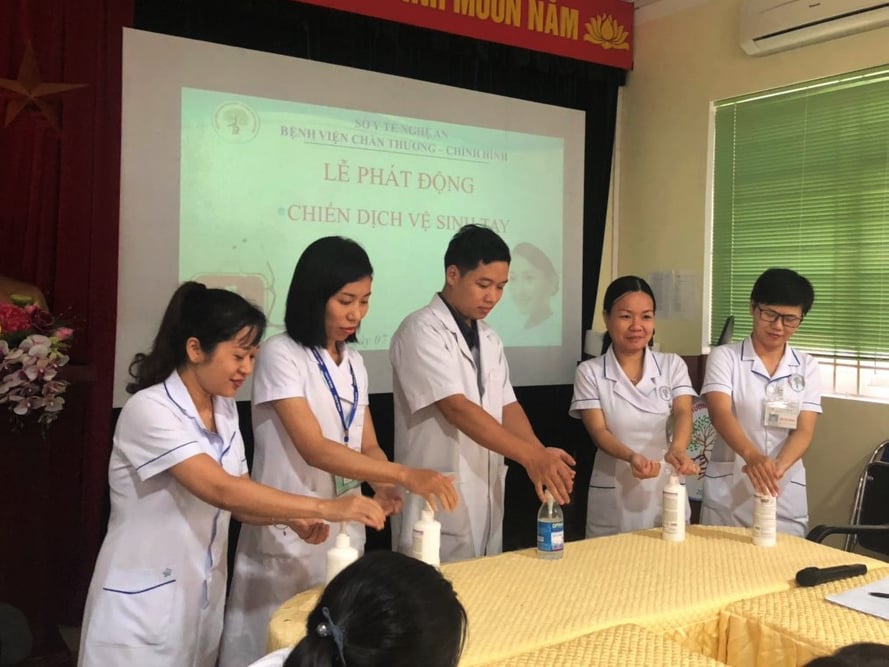 Hưởng ứng chiến dịch “Phòng ngừa nhiễm khuẩn do chăm sóc y tế - chính từ nơi bàn tay bạn” do Tổ chức Y tế Thế giới (WHO) phát động, ngày hôm qua, 7/11/2019, Khoa kiểm soát nhiễm khuẩn - Bệnh viện Chấn thương chỉnh hình Nghệ An đã tổ chức lễ phát động chiến dịch vệ sinh tay tới toàn thể nhân viên y tế. Toàn thể cán bộ công nhân viên Bệnh viện đã cam kết cùng nhau tuân thủ và thực hiện theo “5 thời điểm cần rửa tay đối với nhân viên y tế“ và “quy trình rửa tay 6 bước của Bộ y tế” để cùng chung tay chống lại nguy cơ nhiễm khuẩn.