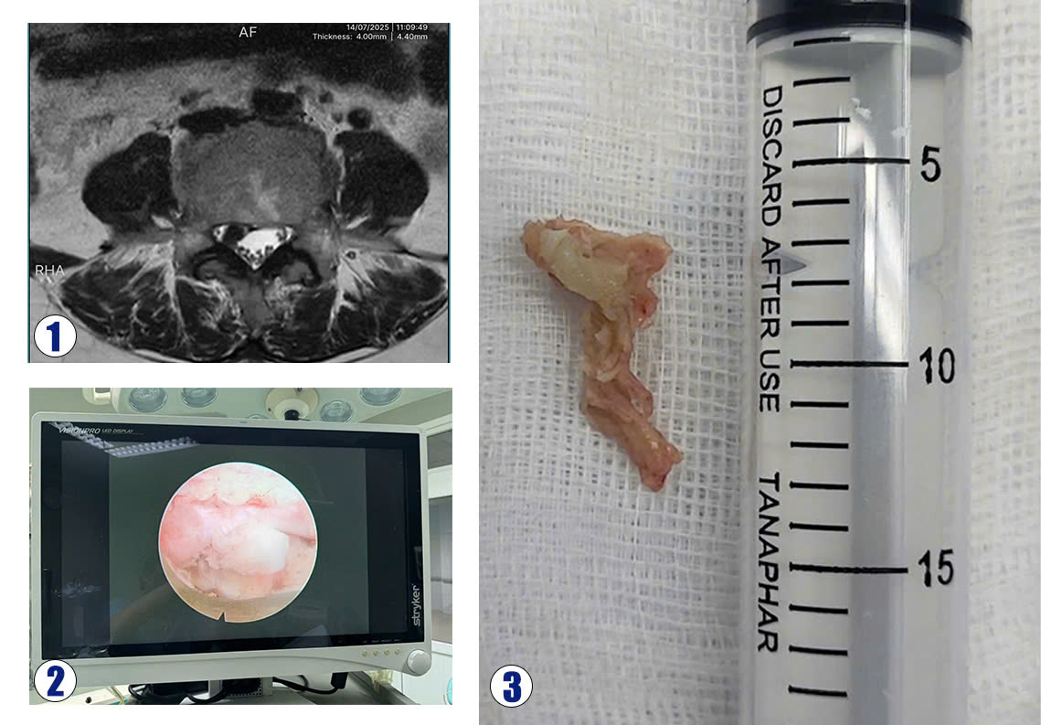 Hình ảnh (1) Khối thoát vị trên phim MRI, (2): Khối thoát vị qua nội soi, (3): Khối thoát vị khi lấy ra