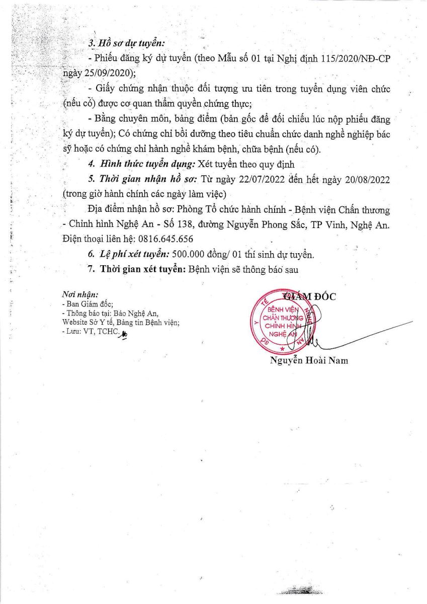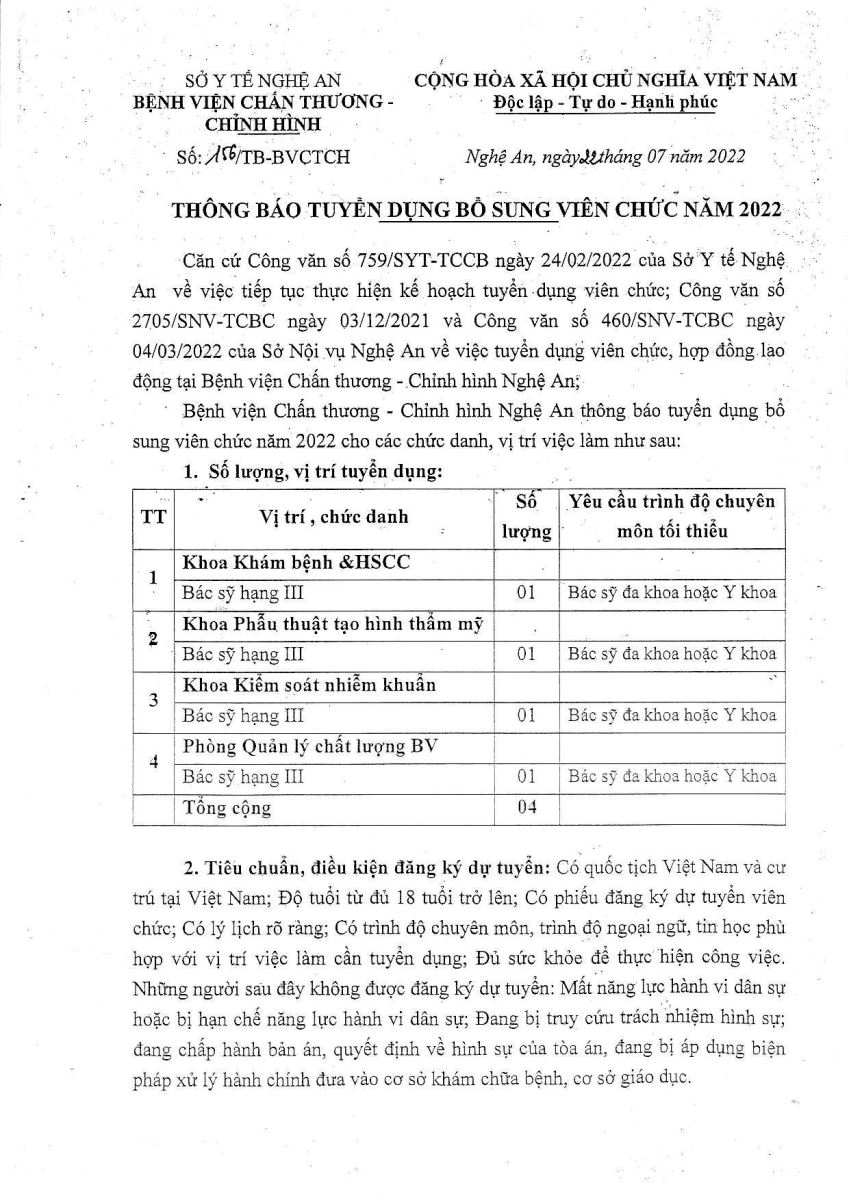 Bệnh viện Chấn thương Chỉnh hình Nghệ An xin thông báo tuyển dụng viên chức bổ sung năm 2022 như sau: