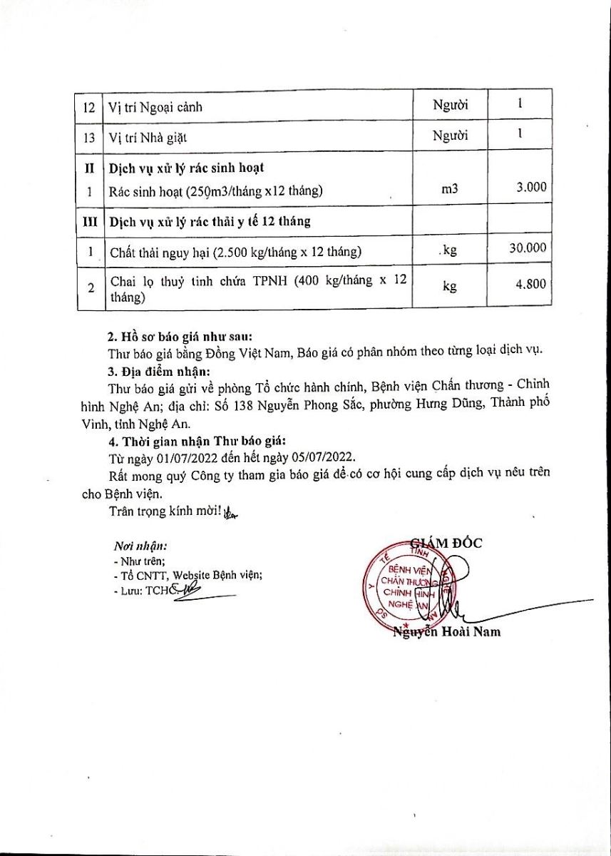 Bệnh viện Chấn thương - Chỉnh hình Nghệ An thông báo mời chào giá: